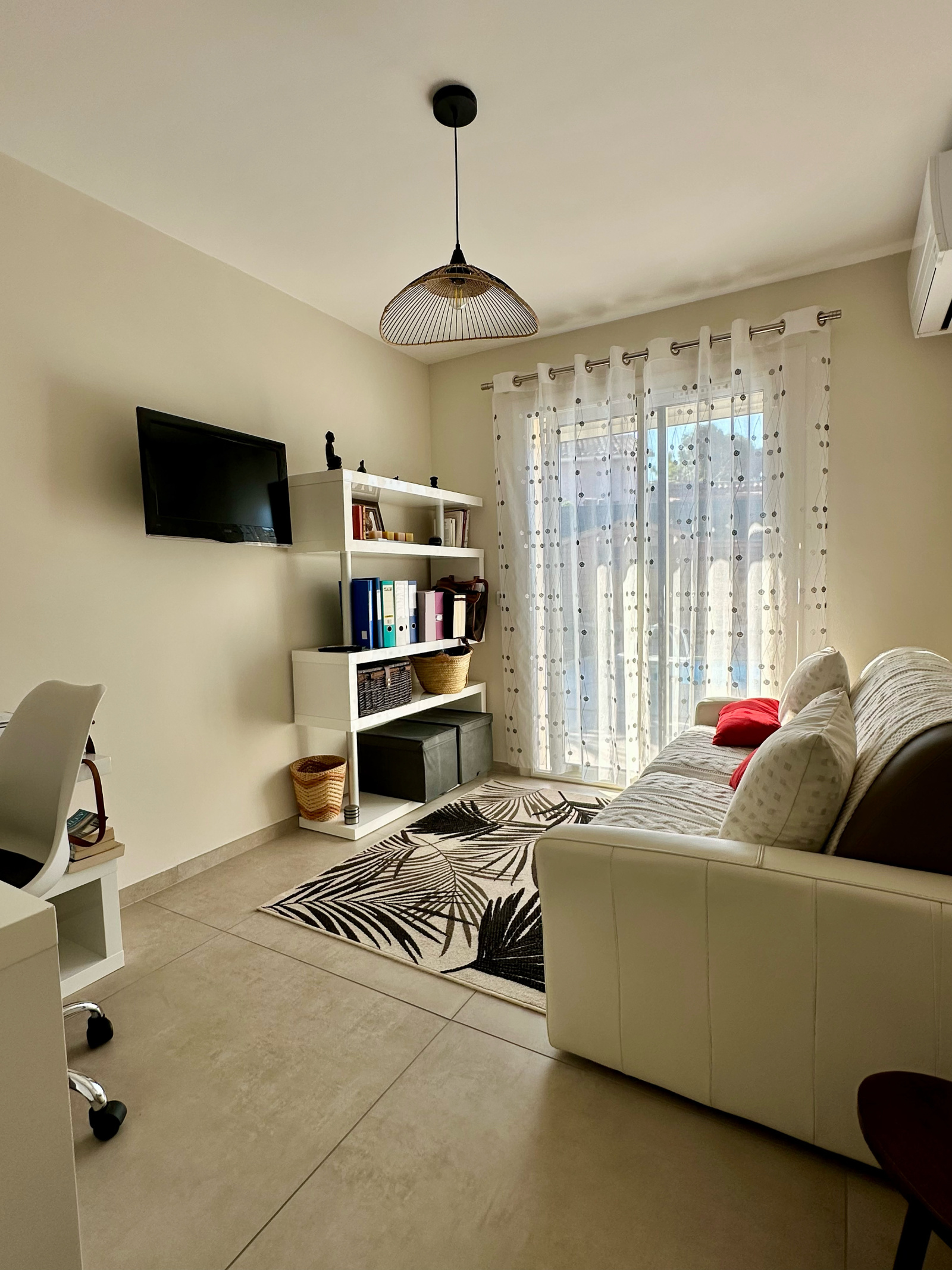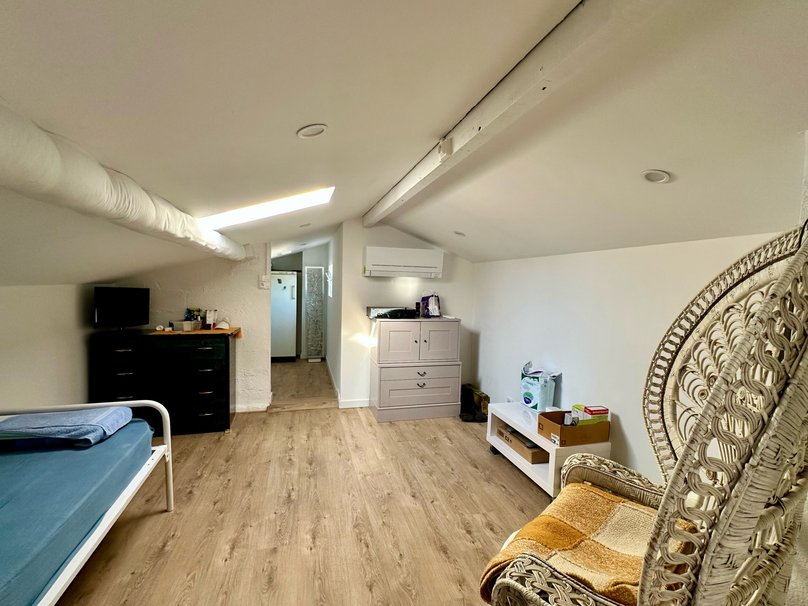 Espace modulable climatisé avec rangements et point d’eau, offrant la possibilité de créer deux chambres supplémentaires, une suite parentale ou un espace de travail