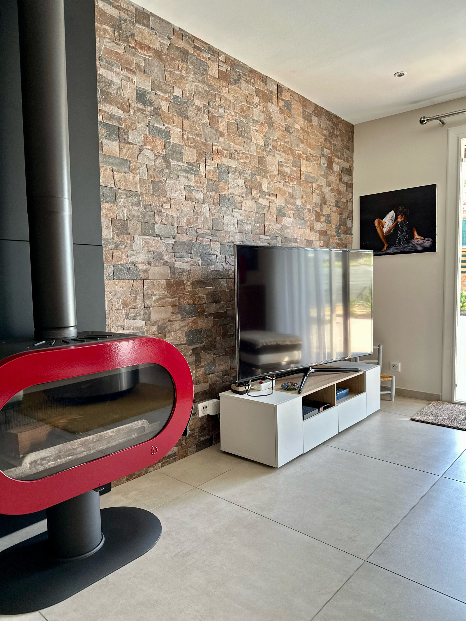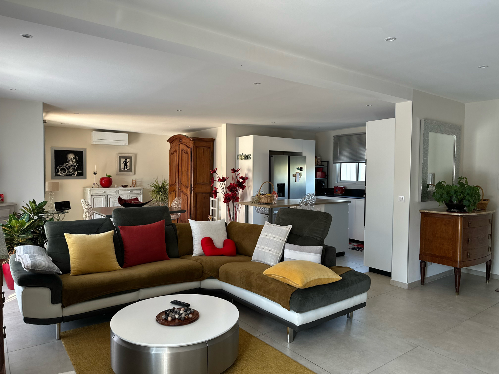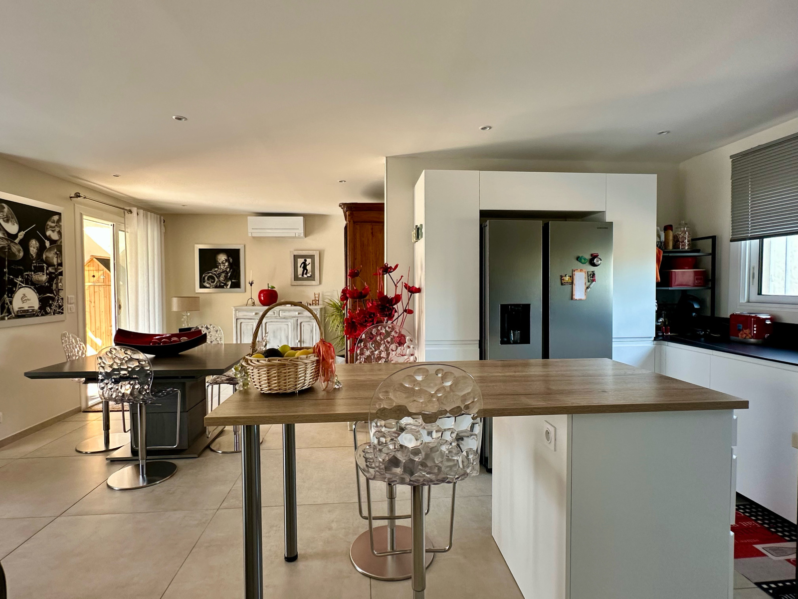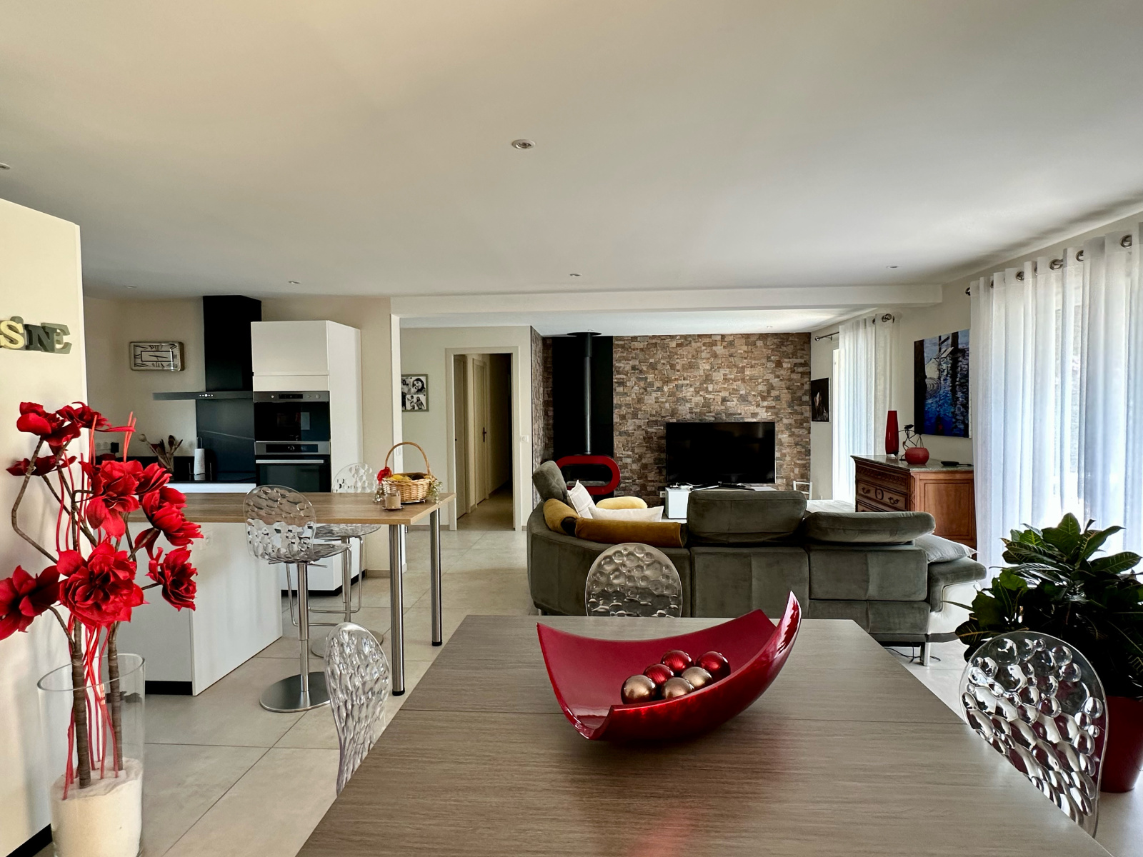 Le séjour traversant exposé plein sud bénéficie d’une luminosité exceptionnelle grâce à ses larges ouvertures donnant sur le jardin. L’ensemble est sublimé par une cuisine ouverte moderne et entièrement équipée, un poêle à bois design, ainsi qu’un système de climatisation réversible pour un confort optimal toute l’année.